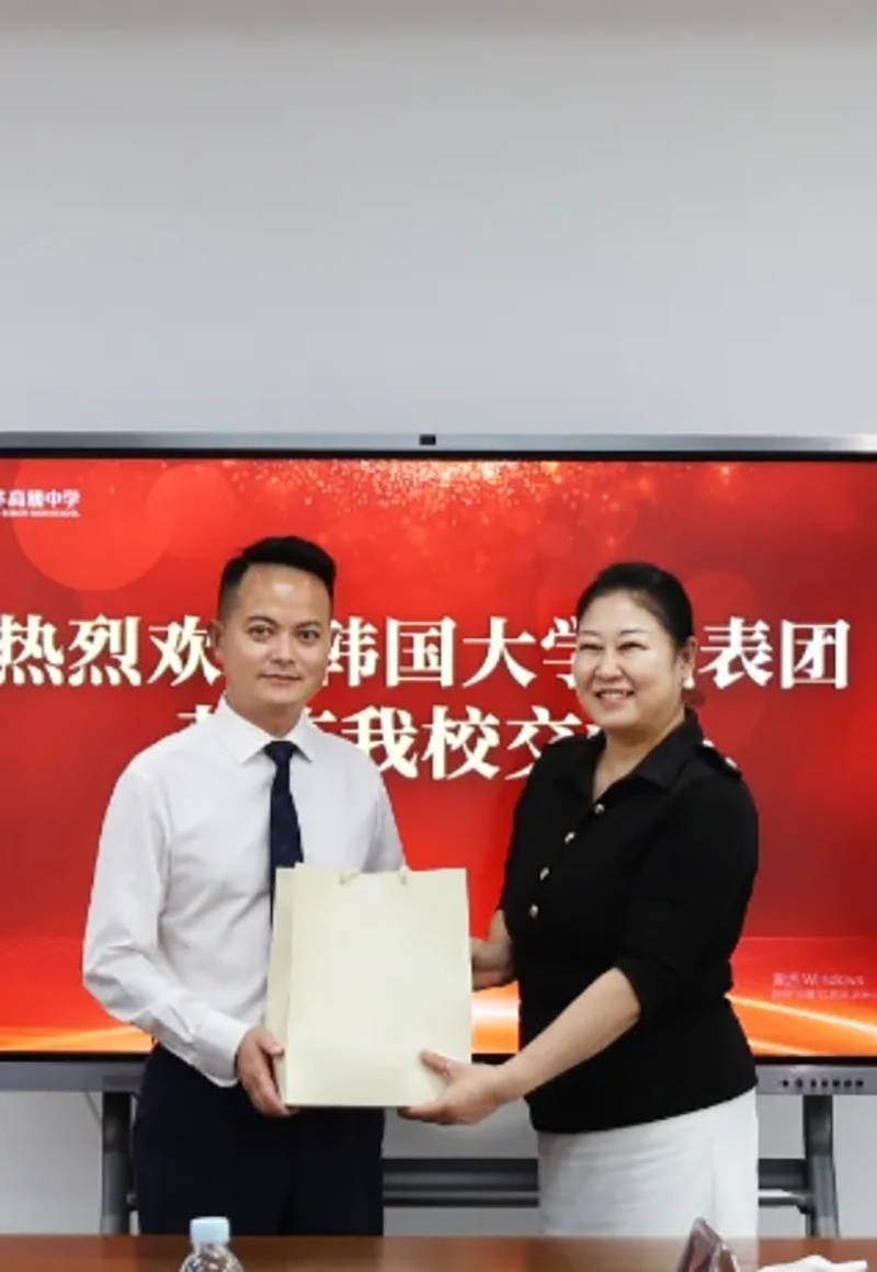 遠道而來的韓國交流團首先參觀了新華高級中學校園。參觀途中,吳東校長向韓國交流團介紹了學校的歷史、辦學理念以及校園文化等。學?,F代化的校園設施、優良的教學環境、先進的教育理念,讓交流團贊不絕口。在現場交流會上,代表團與我?;ハ噘浰土硕Y物。