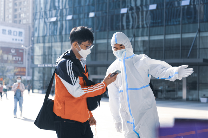 在疫情反撲的態勢下永遠有這樣一群不辭辛勞的戰士們身著白衣,為大家筑起安全屏障“請大家佩戴好口罩,保持1米以上的安全距離出示健康碼,憑碼進入,謝謝配合”。