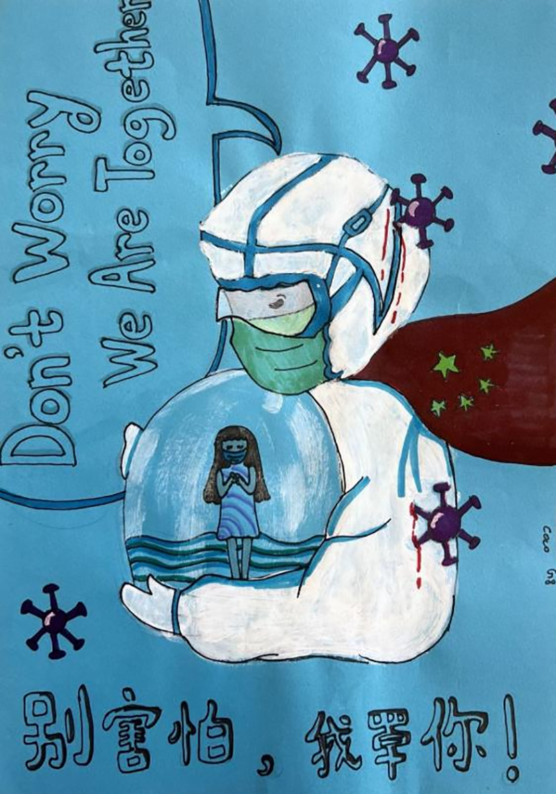 壬寅年初,驚蟄剛過,本是春氣萌動,萬物復蘇。一場突如其來的新冠肺炎疫情侵襲了這座我國,讓原本熙攘繁華的城市變得異常冷清。付出需要被看到,同學們希望醫護人員們知道,我們看見、并感恩他們的辛苦和付出,要拿畫筆記錄下他們的身影,把自己心中的感動通過畫筆傳遞出去。
