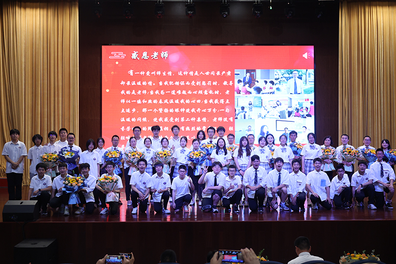 終章散場,學生依次上臺為敬愛的老師們送上鮮花,全體初三老師獻唱《放心去飛》。“放心去飛,勇敢地揮別,這一次說好了不掉眼淚”,我們緊緊相擁,我們微笑話別,祝福彼此,愿少年此去前程似錦,歸來功成名遂!