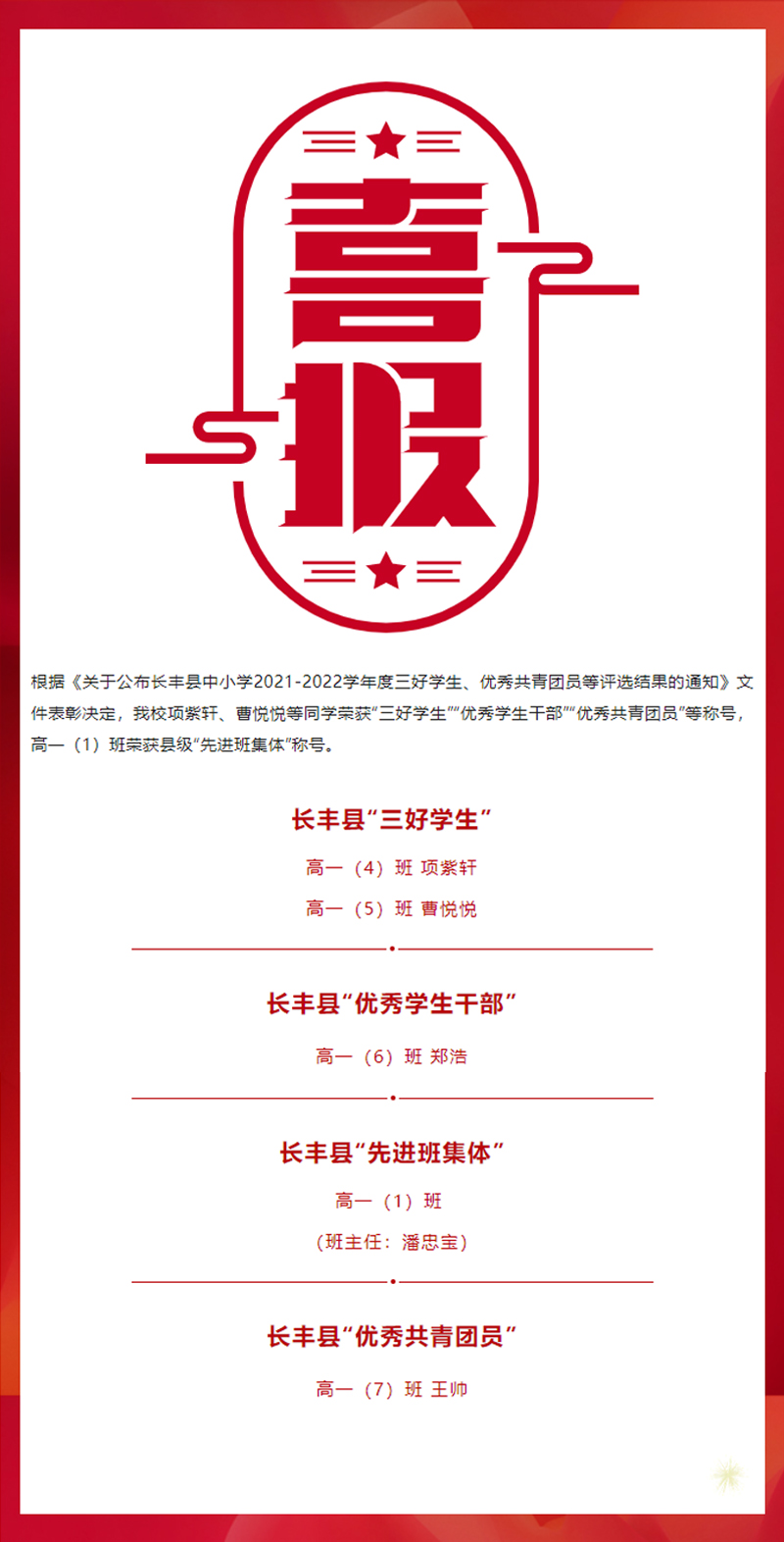 希望受表彰的班級和個人珍惜榮譽,發揚成績,爭取更大進步。希望全校同學以受表彰的同學為榜樣,開拓進取,努力奮進,在今后的學習生活中取得更優異的成績。