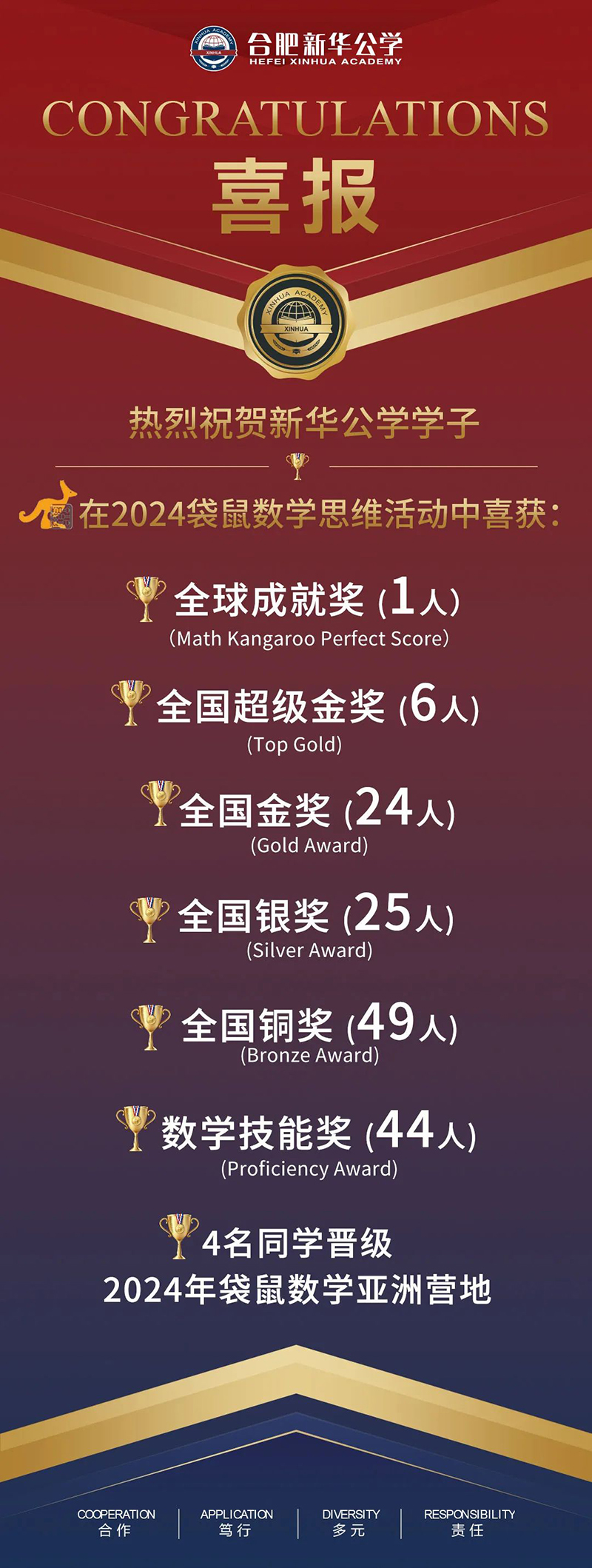 最后,再次祝賀所有獲獎(jiǎng)同學(xué)與參賽同學(xué)!對數(shù)學(xué)的興趣只是起點(diǎn),而在自己感興趣的領(lǐng)域深入鉆研、甚至選擇了高出自身年級(jí)的難度等級(jí)來挑戰(zhàn)自己,這樣的自信力與勇氣更為可貴!我們希望參賽的每一位新華學(xué)子,都能因這樣亮眼的成績而獲得成就感,在以后的學(xué)習(xí)中充滿動(dòng)力、再創(chuàng)佳績!
